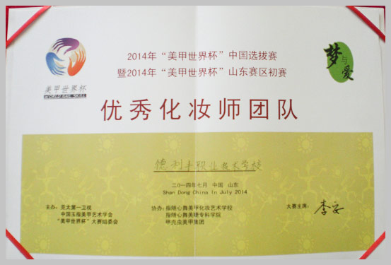 2014年获得“美甲世界杯”中国选拔赛暨2014年“美甲世界杯”山东赛区初赛“优秀化妆师团队”奖